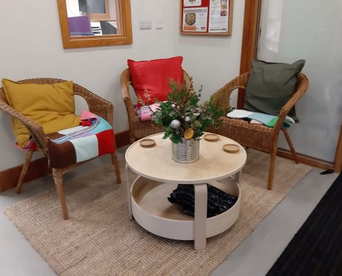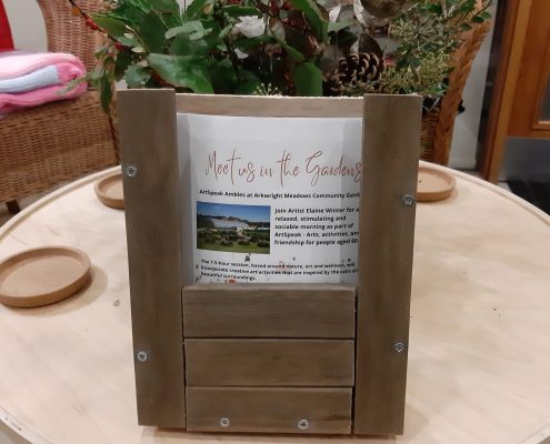We would like to say a huge thank you to the Meadows Library ‘Piecing Together’ sewing group and the OMTRA committee who made and donated our specially knitted blankets. Another huge thank you goes to Iris and Eddie, two of our wonderful AMC volunteers, who have made these wonderful leaflet holders from recycled wood they found in a skip. It is great not having to buy plastic ones and instead have these wonderful hand crafted works of art. Thank you both so much for all your time and effort!